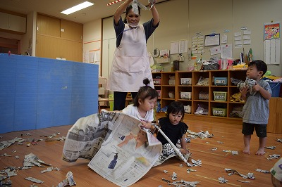 今日ペンギン組のお友達は お部屋で新聞紙遊びをしました♪ びりびり破ったり、パーッと降らせたりと とっても楽しそうに遊んでいました☆ &…