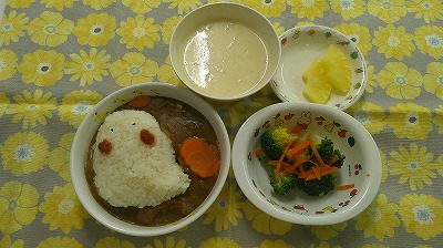 ~今日のお給食~ ・ハロウィンメニュー ・ブロッコリーのサラダ ・コーンスープ ・パイン ~今日のおやつ~ ・牛乳 ・おばけチップス