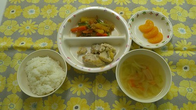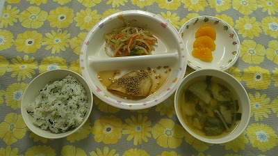 ~今日のお給食~ ・鶏肉の青のり焼き ・カミカミ和え ・ごましおごはん ・コンソメスープ(たまねぎ・キャベツ・にんじん) ・みかん ~今日のおやつ~ ・牛乳 ・焼き…