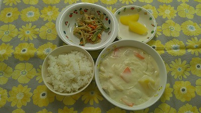 ~今日のお給食~ ・鶏のから揚げ ・三色おにぎり ・ブロッコリーのツナサラダ ・すまし汁 ・モモ ~今日のおやつ~ ・牛乳 ・紅白クッキー  …