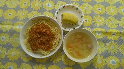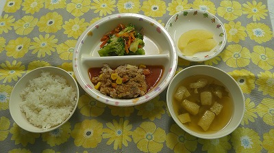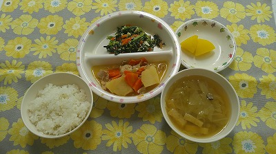 ~今日のお給食~ ・肉じゃが ・ほうれんそうの白和え ・ごはん ・味噌汁(キャベツ・油揚げ・しめじ) ・モモ ~今日のおやつ~ ・お誕生日ケーキ ・牛乳  …