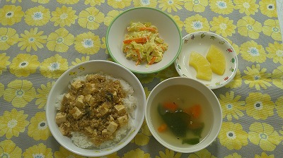 ~今日のお給食~ ・マーボー豆腐丼 ・鶏ささみのカレー風味サラダ ・春雨スープ ・パイン ~今日のおやつ~ ・スイートポテトトースト ・牛乳 &nbs…