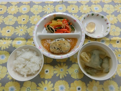 ~今日のお給食~ ・おろしだれハンバーグ ・カミカミ和え ・ごはん ・味噌汁(もやし・わかめ・えのきたけ) ・ミニゼリー ~今日のおやつ~ ・フルーツポンチ ・牛乳…