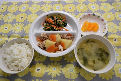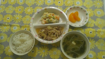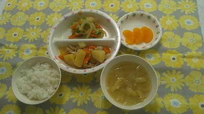 ~今日のお給食~ ・肉じゃが ・大根サラダ ・ごはん ・味噌汁(油揚げ・だいこん・もやし) ・みかん ~今日のおやつ~ ・ミートマカロニ ・牛乳 &n…