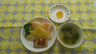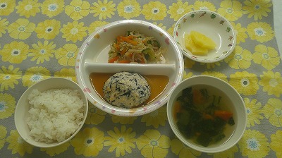 ~今日のお給食~ ・豆腐ハンバーグ ・もやしのナムル ・ごはん ・中華スープ(にんじん・こまつな・えのきたけ) ・パイン ~今日のおやつ~ ・バナナきな粉 ・牛乳 …
