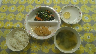 ~今日のお給食~ ・カレイのごま照り焼き ・ほうれんそうの白和え ・ごはん ・味噌汁(じゃがいも・たまねぎ・わかめ) ・ミニゼリー ~今日のおやつ~ ・お誕生日ケー…