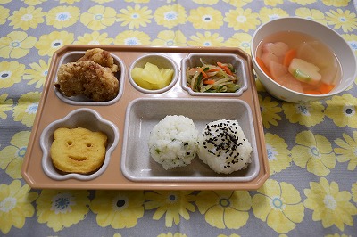 ~今日のお給食~ ・鶏のから揚げ ・おにぎり ・スマイルポテト ・春雨サラダ ・すまし汁(花麩・だいこん・にんじん) ・パイン ~今日のおやつ~ ・桜クッキー ・牛…
