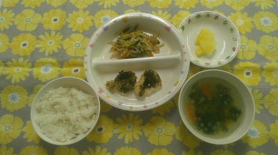 ~今日のお給食~ ・鶏肉の青のり焼き ・もやしのナムル ・ごはん ・春雨スープ ・パイン ~今日のおやつ~ ・ジャムサンド ・牛乳