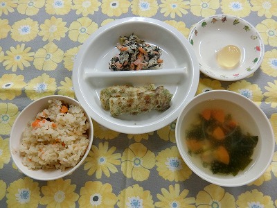 ~今日のお給食~ ・ちくわの磯辺揚げ ・和風コールスローサラダ ・秋の香りご飯 ・春雨スープ ・ミニゼリー ~今日のおやつ~ ・お誕生日ケーキ ・牛乳 …