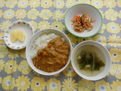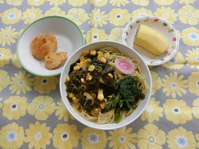 ~今日のお給食~ ・鶏つくね ・キャベツのおかか和え ・わかめごはん ・コーンスープ ・モモ ~今日のおやつ~ ・バナナきな粉 ・牛乳 …