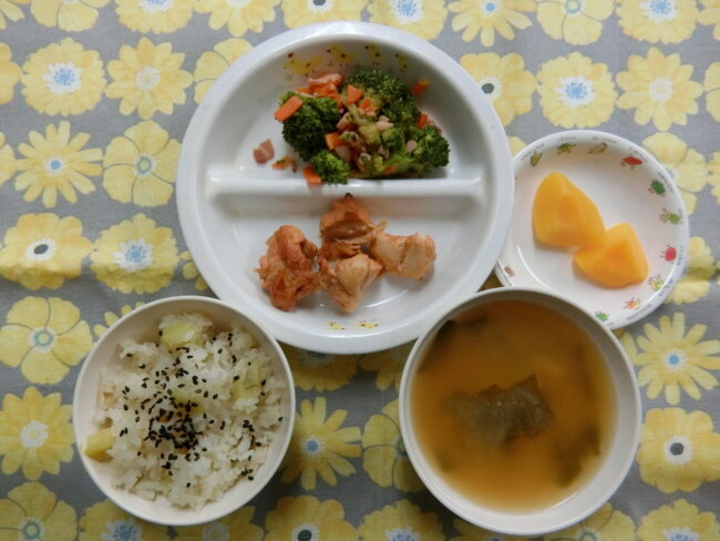 ~今日のお給食~ ・タンドリーチキン ・ブロッコリーのサラダ ・さつまいもごはん ・味噌汁(豆腐・なめこ・わかめ) ・モモ ~今日のおやつ~ ・牛乳 …