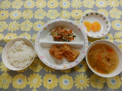 ~今日のお給食~ ・たれづけからあげ ・もやしのナムル ・ごはん ・味噌汁(はくさい・にんじん・しめじ) ・みかん ~今日のおやつ~ ・シュガートースト ・牛乳 &…