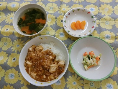 ~今日のお給食~ ・マーボー豆腐丼 ・もやしの中華サラダ ・味噌汁(キャベツ・えのきたけ・にんじん) ・みかん ~今日のおやつ~ ・麦茶 ・ヨーグルト…