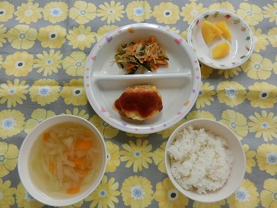 ~今日のお給食~ ・ポテサラバーグ ・きゅうりのサラダ ・ごはん ・コンソメスープ(たまねぎ・キャベツ・にんじん) ・モモ ~今日のおやつ~ ・おいな…