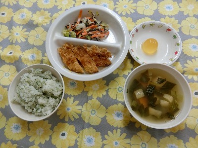 ~今日のお給食~ ・サクサクチキン ・あおさごはん ・キャベツとひじきの和風和え ・味噌汁(にんじん・こまつな・とうふ・油揚げ) ・ミニゼリー ~今日…