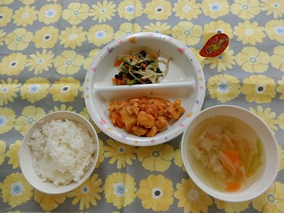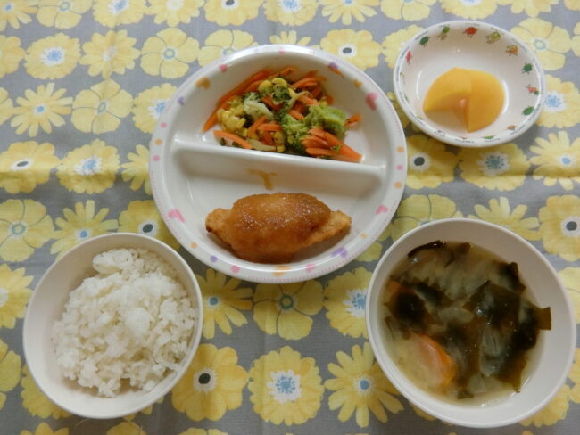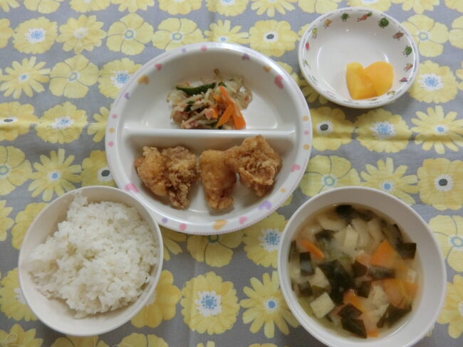 ~今日のお給食~ ・鶏のからあげ ・ごはん ・もやしの中華風和え物 ・味噌汁(こまつな・油揚げ・にんじん) ・モモ ~今日のおやつ~ ・ジャムサンド …