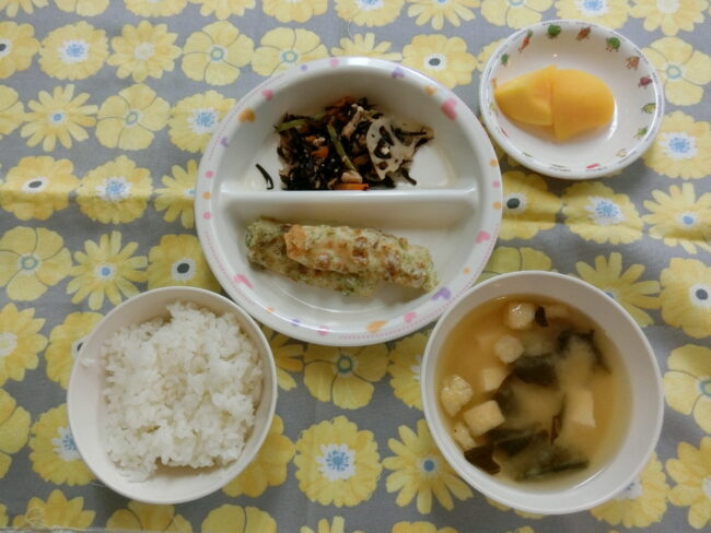 ~今日のお給食~ ・ちくわの磯辺揚げ ・ひじきの炒め煮 ・ごはん ・味噌汁(ほうれんそう・油揚げ・豆腐) ・モモ ~今日のおやつ~ ・牛…