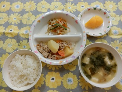~今日のお給食~ ・肉じゃが ・もやしのナムル ・ごはん ・味噌汁(こまつな・なめこ・とうふ) ・もも ~今日のおやつ~ ・ヨーグルトプリン ・牛乳 …