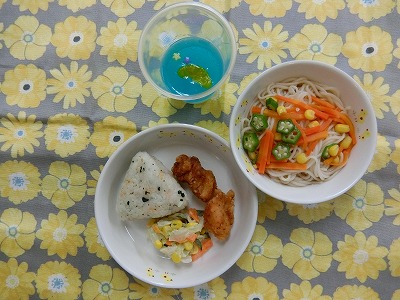 ~今日のお給食~ ・七夕そうめん ・鶏のからあげ ・鮭わかめおにぎり ・コールスローサラダ ・七夕ゼリー ~今日のおやつ~ ・星抜きジャムサンド ・牛乳  …