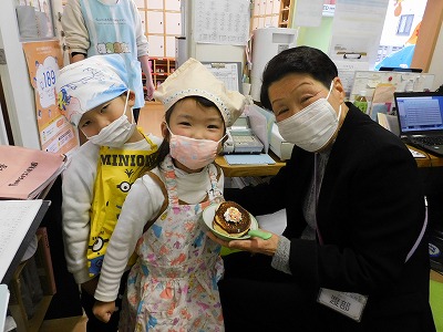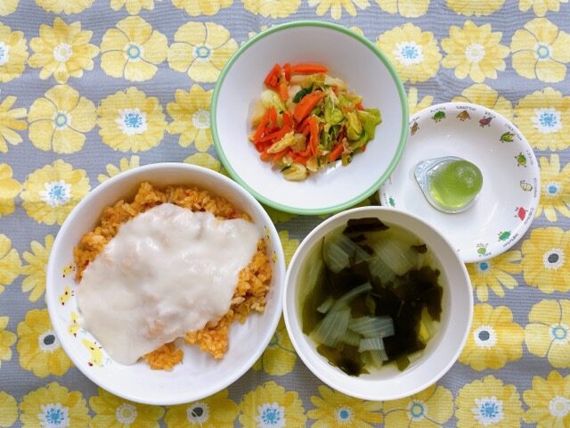 ~今日のお給食~ ・豆腐ハンバーグ ・カミカミ和え ・ごはん ・味噌汁(キャベツ・しめじ・にんじん) ・モモ ~今日のおやつ~ ・牛乳 ・お誕生日ケー…