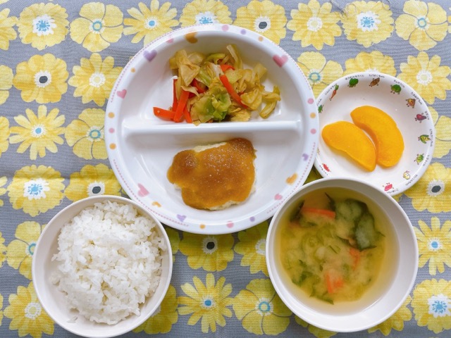 ~今日のお給食~ ・おろしだれハンバーグ ・キャベツのごま和え ・ごはん ・味噌汁(小松菜・えのきたけ・にんじん) ・みかん ~今日のおやつ~ ・牛乳…