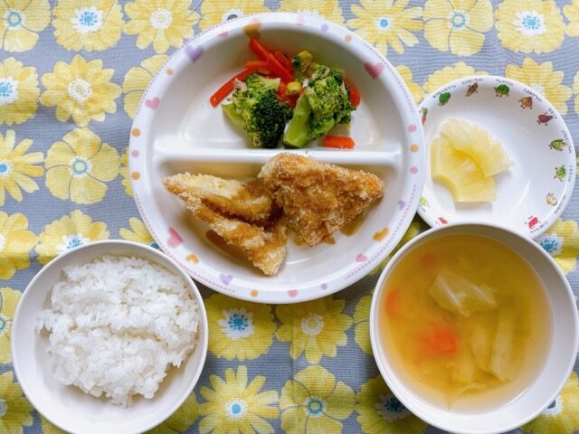 ~今日のお給食~ ・はんぺんフライ ・ブロッコリーのツナ和え ・ごはん ・味噌汁(キャベツ・にんじん・えのきたけ) ・パイン ~今日のおやつ~ ・牛乳…