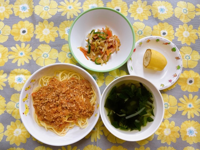 ~今日のお給食~ ・ミートスパゲティ ・もやしのナムル ・わかめスープ ・バナナ ~今日のおやつ~ ・牛乳 ・マシュマロコーンフレーク …