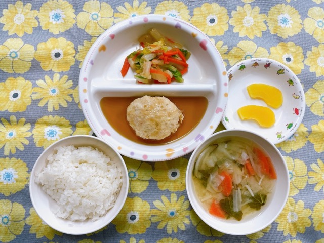 ~今日のお給食~ ・切干大根のハンバーグ ・白菜のおかか和え ・ごはん ・味噌汁(大根・えのきたけ・人参) ・モモ ~今日のおやつ~ ・牛乳 ・おかき…