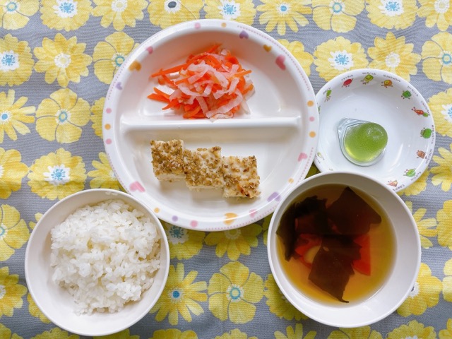 ~今日のお給食~ ・ささみカツ ・ブロッコリーのツナ和え ・ごはん ・味噌汁(わかめ・お麩・長ネギ) ・モモ ~今日のおやつ~ ・豆乳 ・ビスケット …
