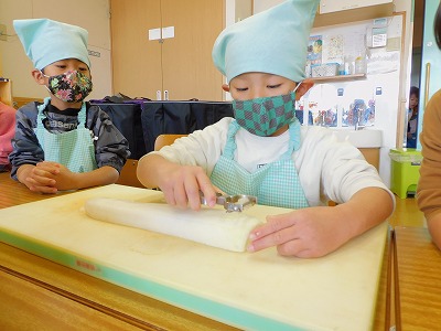 今日は5歳児クラスで切干大根を作りました(*^-^*) 干した大根は、長く日持ちすること 干した大根は栄養満点だということを教えてもらいました。 うんうんと頷きなが…