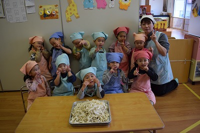 今日は2歳児クラスで食育活動として きのこ割きを行いました♪ 使用したのは、しめじ、エリンギ、えのきたけの3種類です。 身支度を整え、手をきれいに洗い・・・ きのこの割き方のお話…