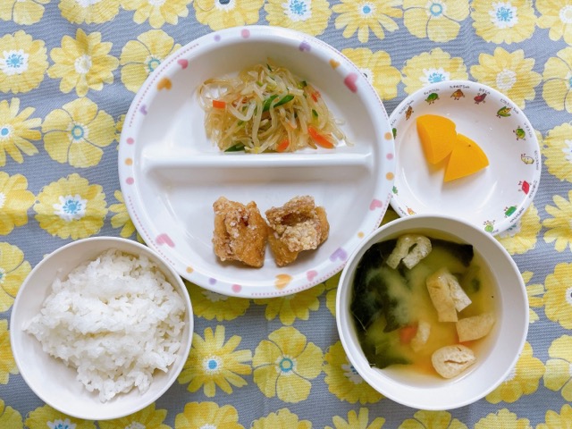 ~今日のお給食~ ・鶏のからあげ ・春雨サラダ ・ごはん ・味噌汁(ほうれんそう・油揚げ・にんじん) ・モモ ~今日のおやつ~ ・牛乳 ・コーンフレー…