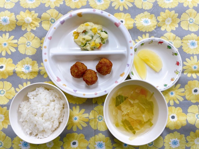 ~今日のお給食~ ・ミートボール ・ポテトサラダ ・ごはん ・コンソメスープ(キャベツ・たまねぎ・にんじん) ・りんご ~今日のおやつ~ ・牛乳 ・フ…