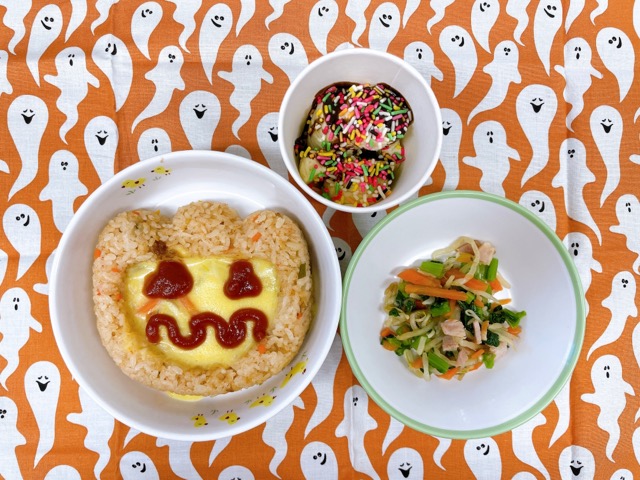 ~今日のお給食~ ・ハロウィンシチュー ・小松菜サラダ ・ケチャップライス ・チョコバナナ ~今日のおやつ~ ・牛乳 ・ハロウィンクッキー  …