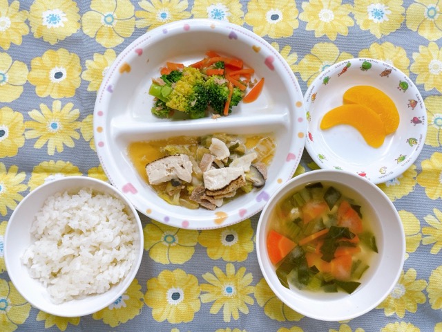 ~今日のお給食~ ・鶏のからあげ ・小松菜サラダ ・ごはん ・味噌汁(白菜・にんじん・しめじ) ・モモ ~今日のおやつ~ ・牛乳 ・マシュマロサンド …