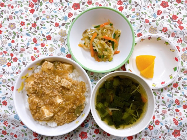 〜今日のお給食〜 ・マーボー豆腐丼 ・もやしのナムル ・中華スープ(ニラ、小松菜、えのきたけ、にんじん) ・モモ 〜今日のおやつ〜 ・牛乳 ・コーントースト &nb…