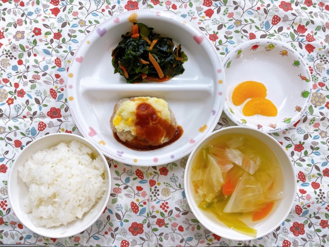 ~今日のお給食~ ・ポテサラバーグ ・きゅうりとわかめのサラダ ・ごはん ・コンソメスープ(キャベツ・にんじん・たまねぎ) ・みかん ~今日のおやつ~…