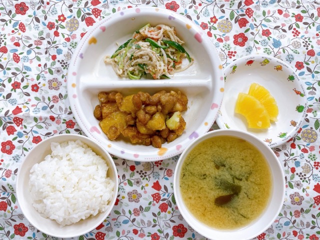 ~今日のお給食~ ・サクサクチキン ・カミカミ和え ・ごはん ・味噌汁(ほうれんそう・しめじ・豆腐) ・みかん ~今日のおやつ~ ・りん…