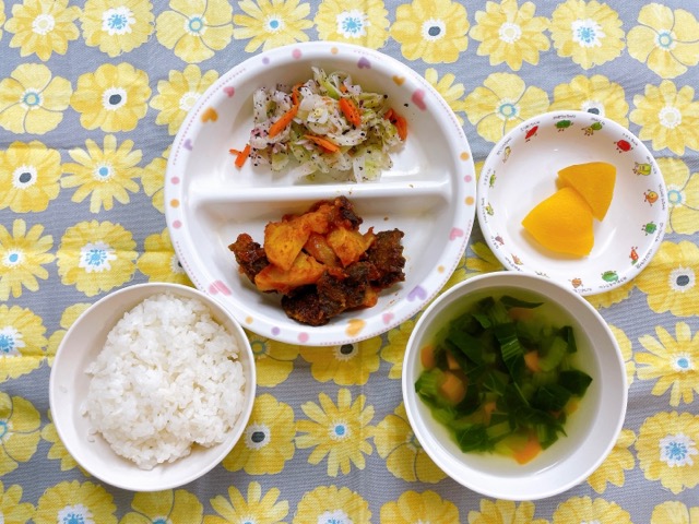 ~今日のお給食~ ・レバーとポテトのオーロラソース ・キャベツのゆかり和え ・ごはん ・春雨スープ ・モモ ~今日のおやつ~ ・牛乳 ・マヨコーンパン…