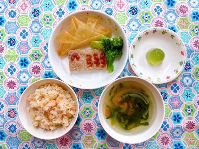 ~今日のお給食~ ・こいのぼりハンバーグ ・チーズかぶと ・ブロッコリー ・鮭ごはん ・コンソメスープ(小松菜・にんじん・たまねぎ) ・ミニゼリー ~…