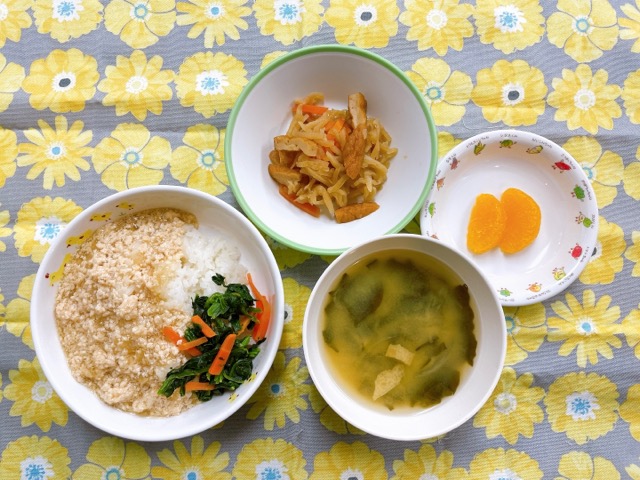 ~今日のお給食~ ・そぼろ丼 ・さつまいもの煮物 ・味噌汁(わかめ・たまねぎ・じゃがいも) ・みかん ~今日のおやつ~ ・牛乳 ・フライドポテト &n…