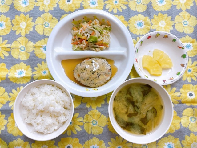 ~今日のお給食~ ・豆腐ハンバーグ ・キャベツのごまだれサラダ ・ごはん ・味噌汁(もやし・わかめ・しめじ) ・パイン ~今日のおやつ~ ・牛乳 ・あ…