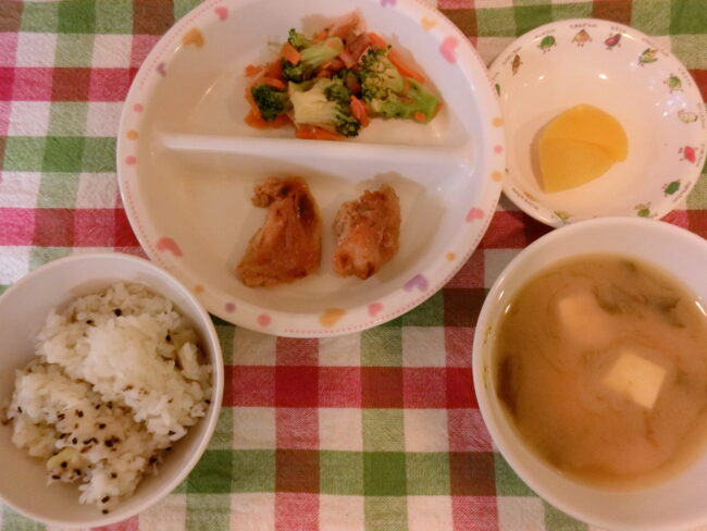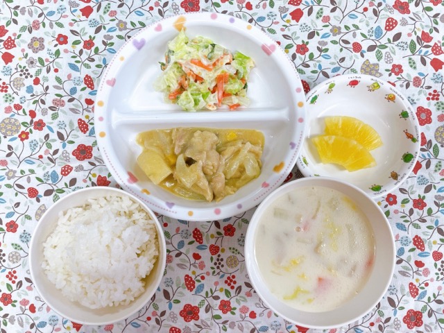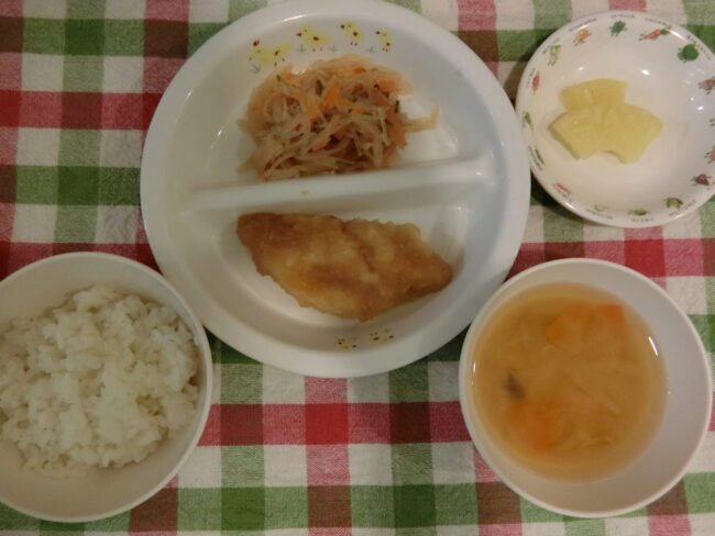 ~今日のお給食~ ・マヨカレーチキン ・コールスローサラダ ・ごはん ・豆乳スープ ・パイン ~今日のおやつ~ ・りんごジュース ・おさつフライ &n…