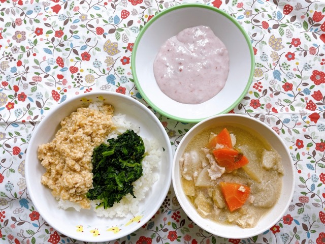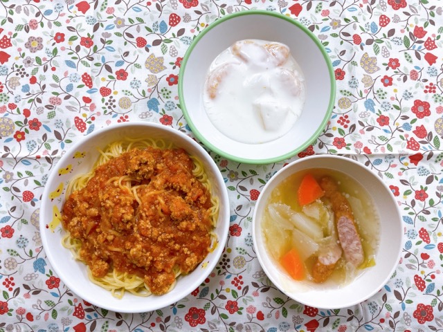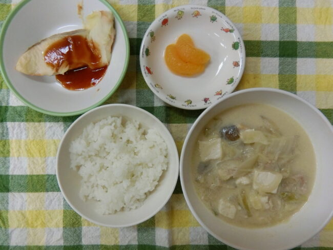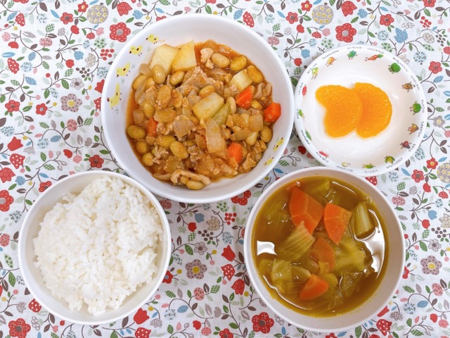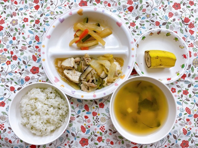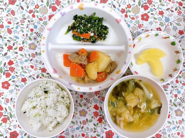 ~今日のお給食~ ・肉じゃが ・ほうれんそうの白和え ・わかめごはん ・味噌汁(キャベツ・しめじ・油揚げ) ・りんご ~今日のおやつ~ ・牛乳 ・ミー…
