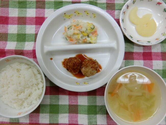 ~今日のお給食~ ・ミートボール ・ポテトサラダ ・ごはん ・コンソメスープ ・りんご ~今日のおやつ~ ・牛乳 ・フライドポテト &n…