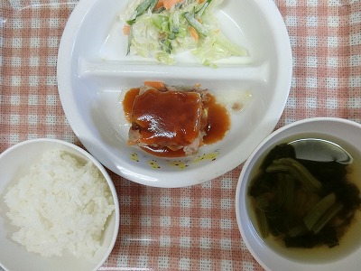 ~今日のお給食~ ・トマトハンバーグ ・小松菜サラダ ・ごはん ・味噌汁(高野豆腐・キャベツ・しめじ) ・モモ ~今日のおやつ~ ・牛乳 ・とうもろこし  …