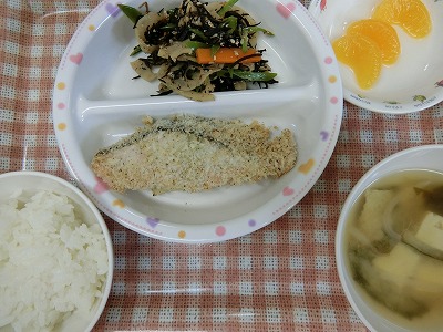~今日のお給食~ ・鮭のパン粉焼き ・豆腐とひじきの煮物 ・ごはん ・味噌汁(もやし・わかめ・豆腐) ・みかん ~今日のおやつ~ ・牛乳 ・ホットケーキ  …