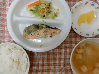 ~今日のお給食~ ・鮭のみそマヨネーズ焼き ・キャベツのごま和え ・ごはん ・味噌汁(もやし・にんじん・油揚げ) ・モモ ~今日のおやつ~ ・牛乳 ・ハムチャーハン…