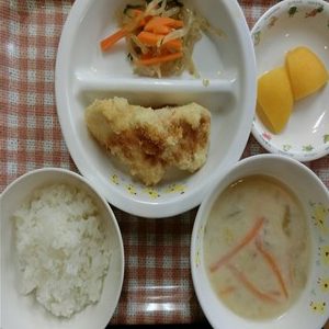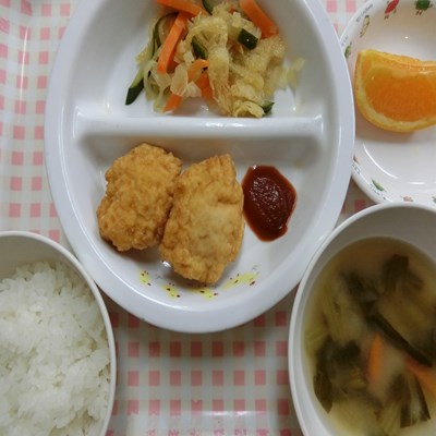 ~今日のお給食~ ・豆腐のナゲット ・カリカリ油揚げのサラダ ・ごはん ・ほうれんそうとにんじんの味噌汁 ・みかん ~今日のおやつ~ ・チヂミ