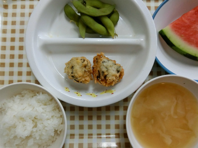 ~今日のお給食~ ・たれづけからあげ ・えだまめとひじきのサラダ ・ごはん ・もやしとしめじの味噌汁 ・スイカ ~今日のおやつ~ ・アイスクリーム ・ウエハース